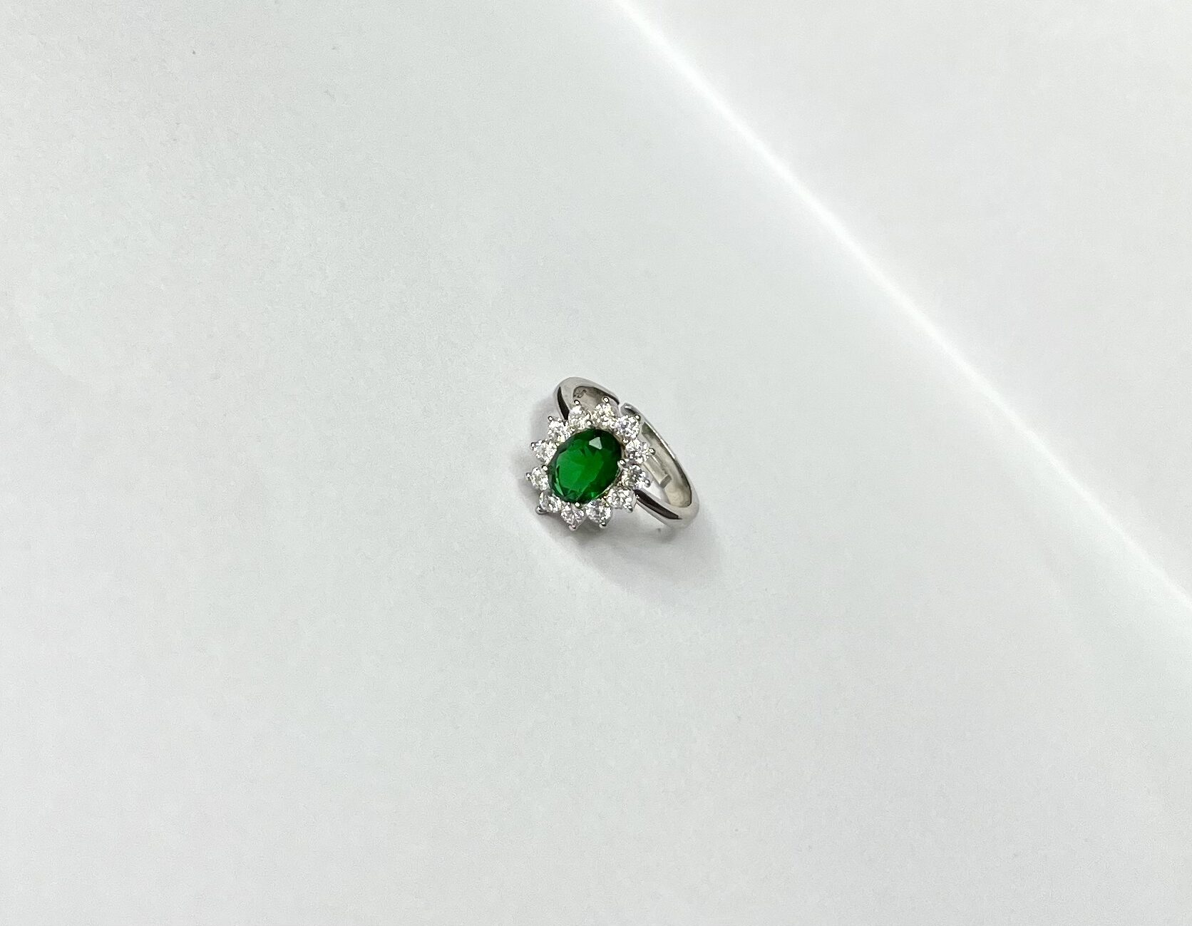A delicate silver ring featuring an oval-shaped vibrant green gemstone at its center. The stone is surrounded by a cluster of small, sparkling clear stones, giving the ring an elegant and refined look.