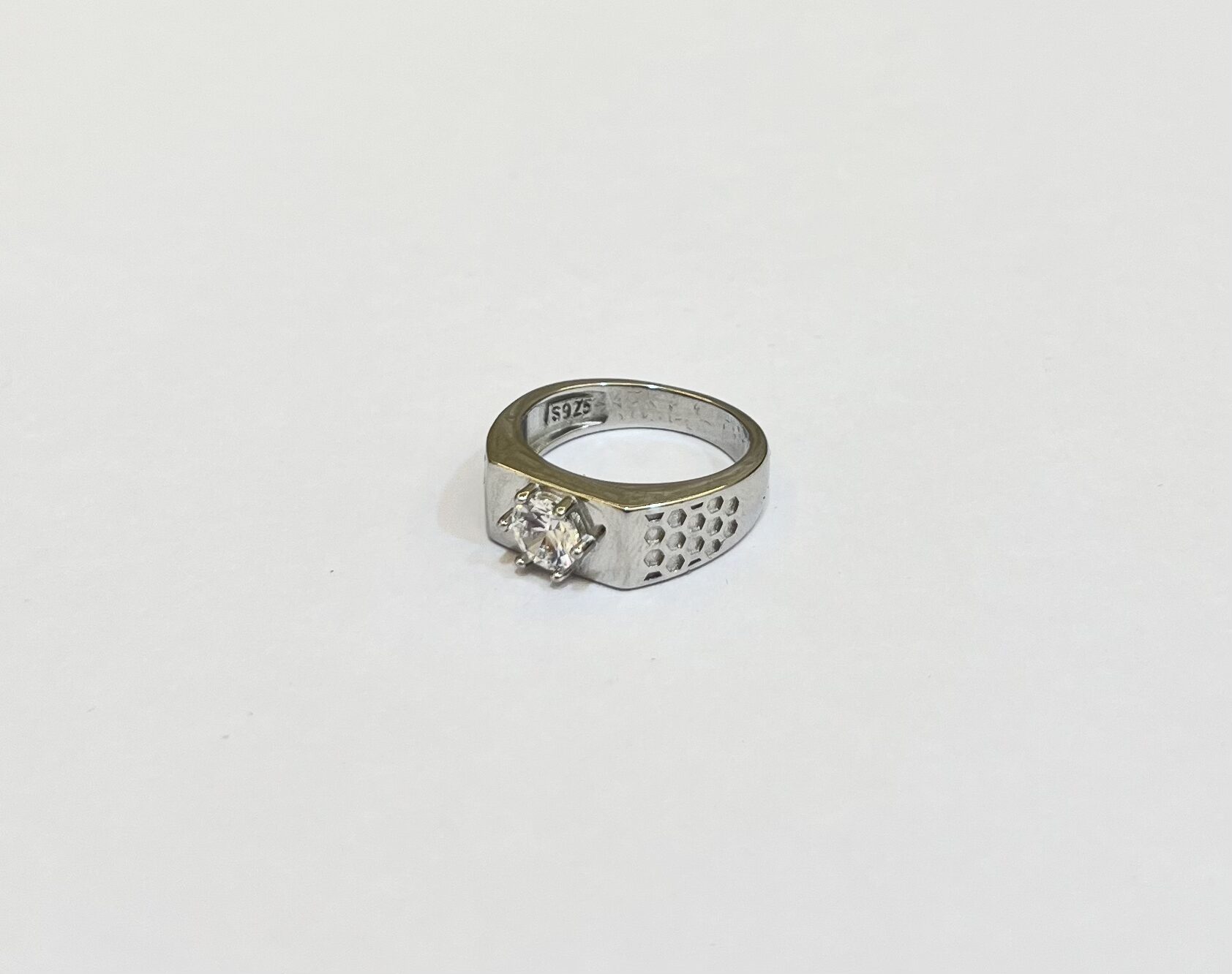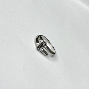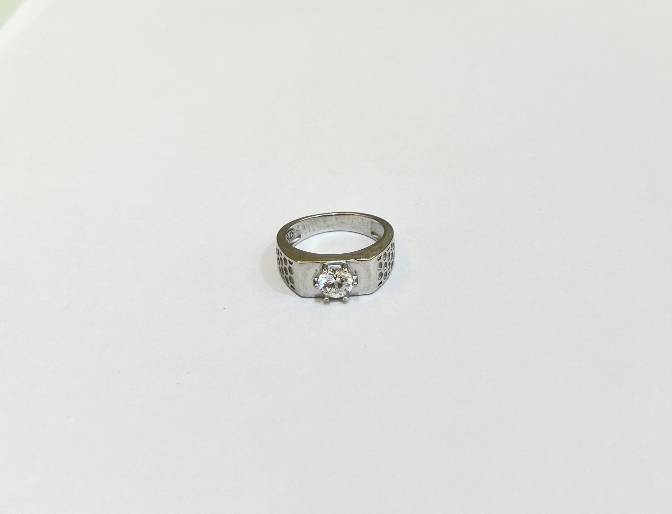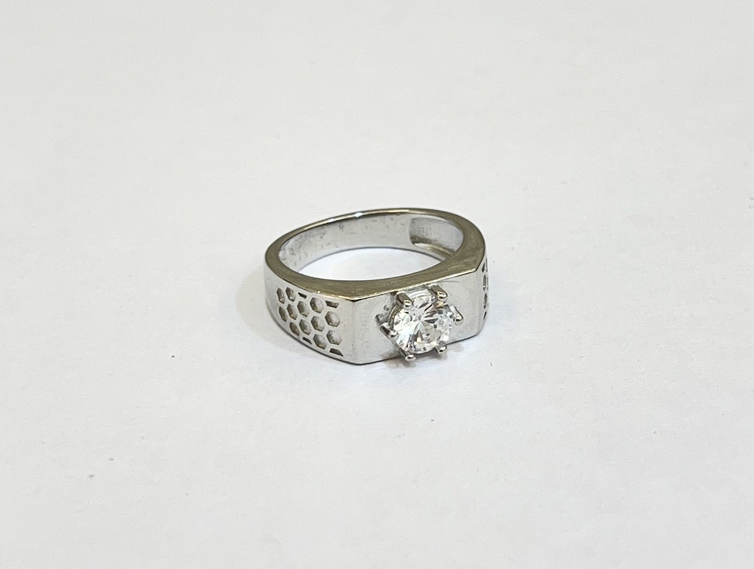 Stylish silver-toned ring featuring a single sparkling stone set on a broad band with subtle cutwork detailing. A perfect blend of elegance and modern design, ideal for daily wear or special occasions.”